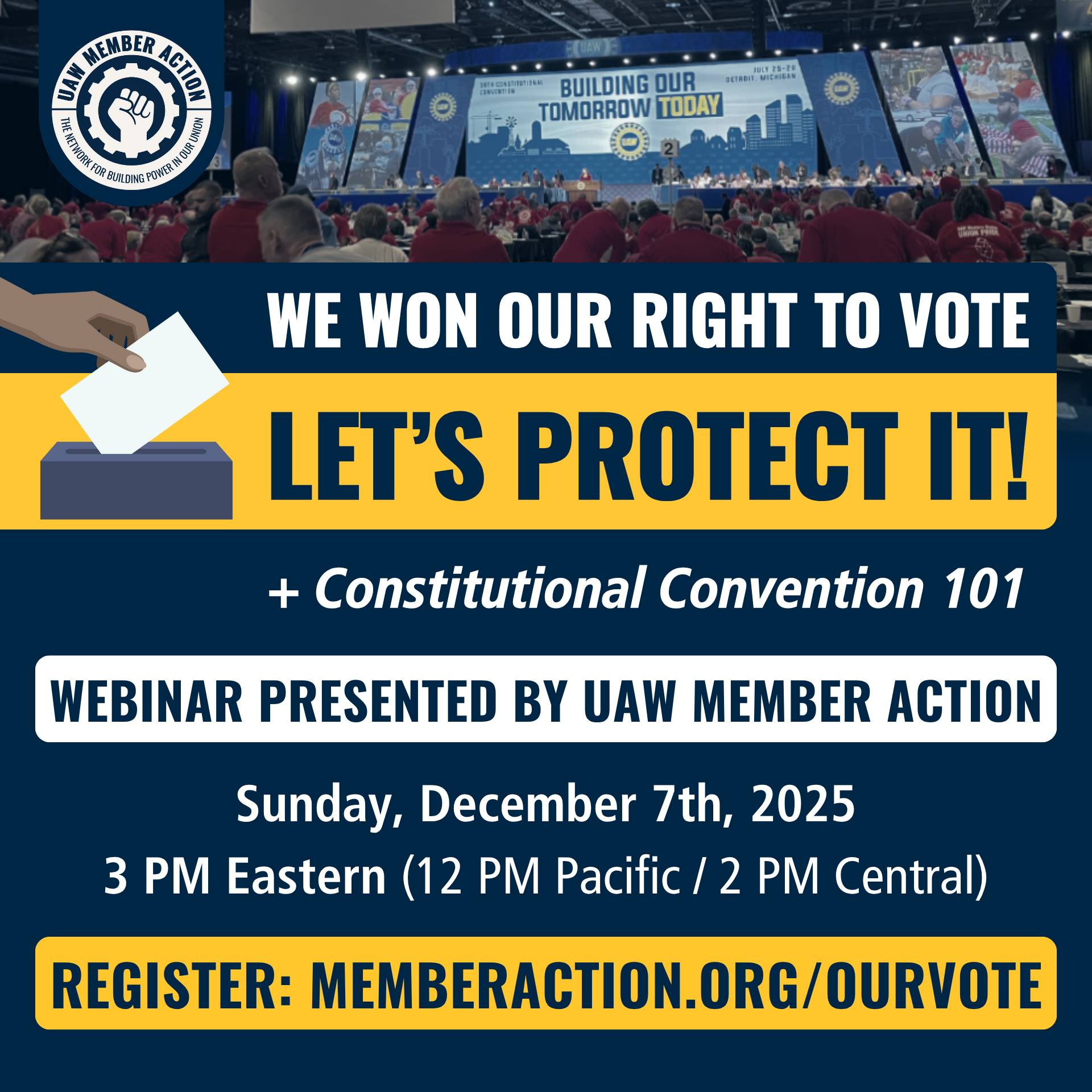 Join this webinar to hear about how UAW members won the right to elect our international officers, why it matters, and how we can protect this right for years to come. Plus, learn about the roles of delegates and what to expect as we head toward next year’s Constitutional Convention.